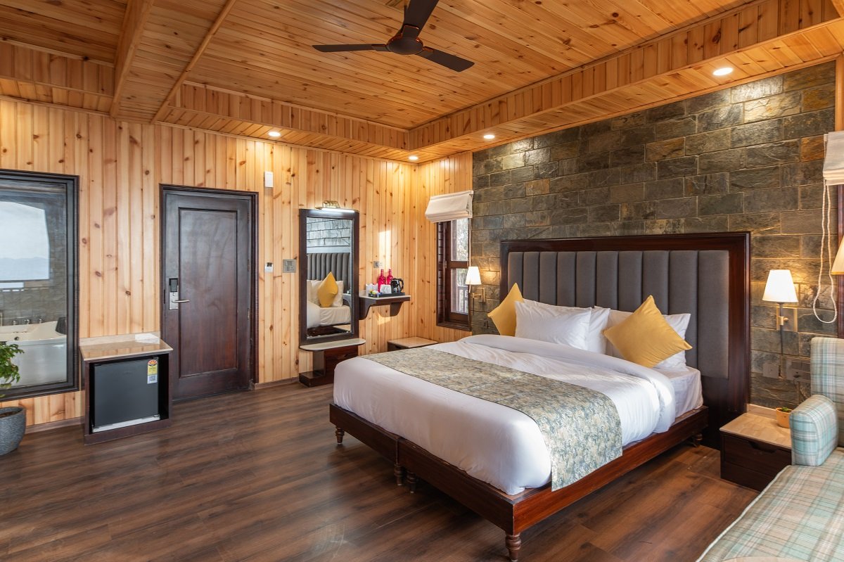 The Buransh Retreat isn't just a room; it’s a vantage point. The interior architecture features soaring wooden ceilings and rustic stone walls, creating a grand yet intimate atmosphere.