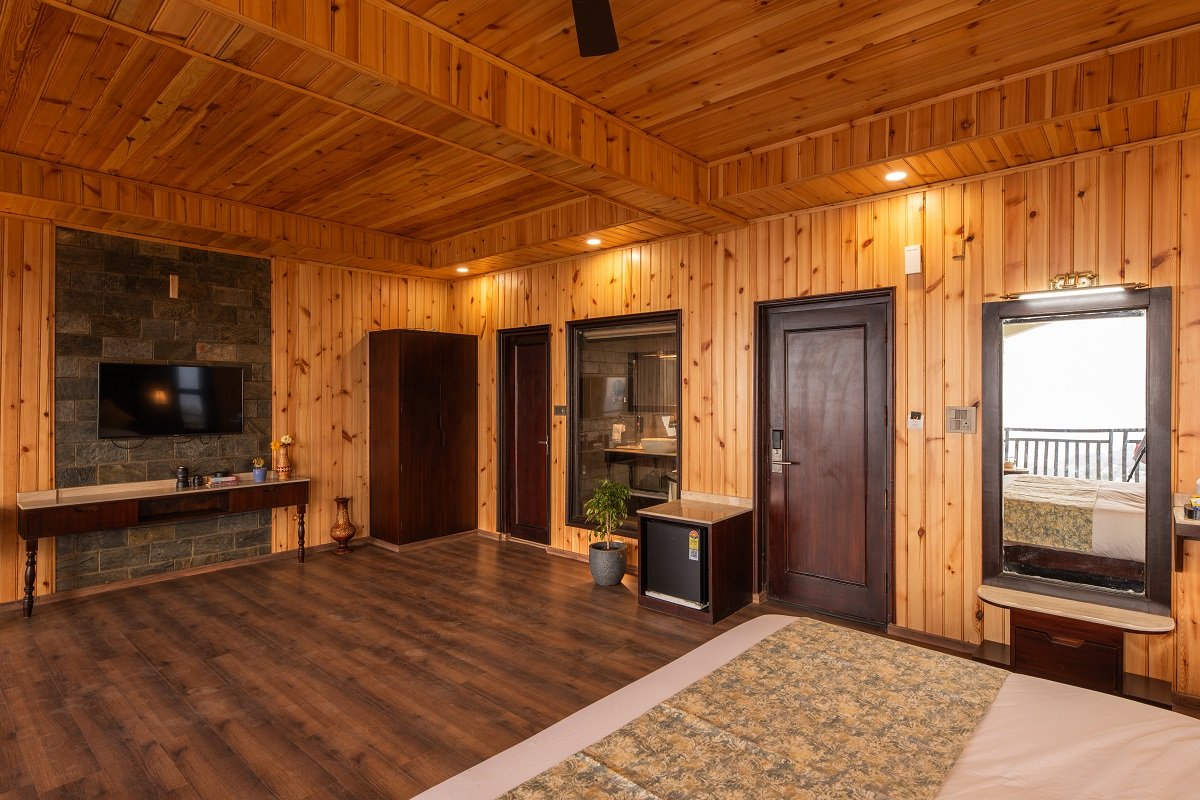 The Buransh Retreat isn't just a room; it’s a vantage point. The interior architecture features soaring wooden ceilings and rustic stone walls, creating a grand yet intimate atmosphere.